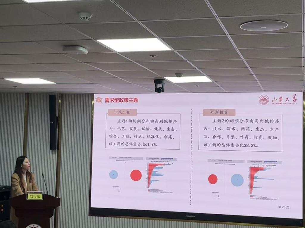 郇晓萌以“政策工具视角下我国深远海养殖政策量化研究”为题,详细介绍如何基于海洋渔业管理的政策需求构建研究思路,以及使用语料库、LDA主题模型等方法进行数据分析和政策提取的过程。她不仅关注到深远海养殖业的产业前景,还结合实证研究提出了针对不同类型深远海养殖模式的政策建议,为未来的海洋产业发展提供了参考。